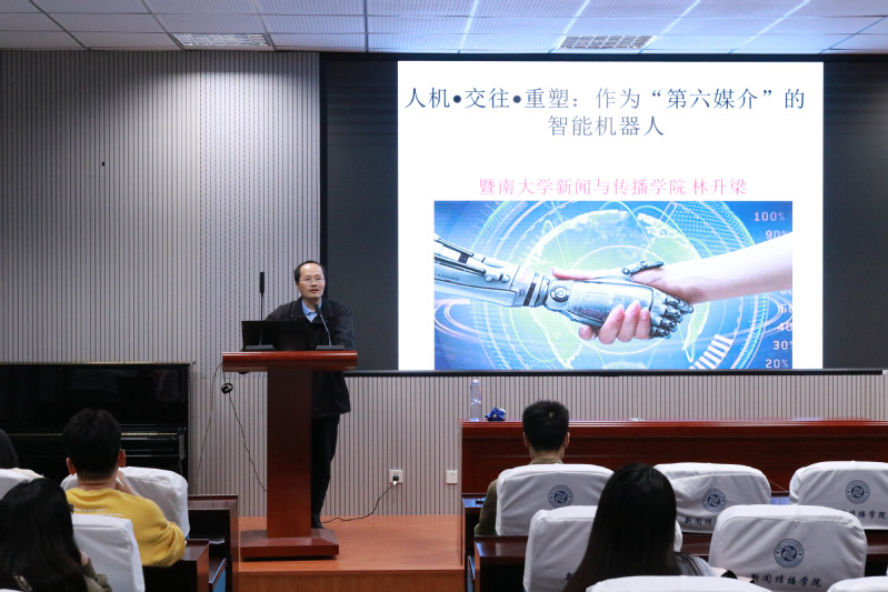 “什么是第六媒介?”林升梁教授带领同学们回顾客观历史社会的发展,通过介绍大众传播媒介概念的演进一步步导出“未来时代、媒介即人”的结论——智能机器人就是所谓的“第六媒介”。教授结合媒介讨论的热点,详解“裸眼3D视频”、讲述柏拉图寓言故事......在林教授深入浅出的解析中,同学们对人机交互的基础与趋势有了更加深入的了解。“我们需要冷静观察与开放迎接智能机器人催生的‘第六媒介’的到来。”林教授如是说。作为媒体人,不仅要前瞻性地认识到“第六媒介”带来的创造性价值,还应该直视智能机器人时代的转型危机,进行深刻的伦理反思。
