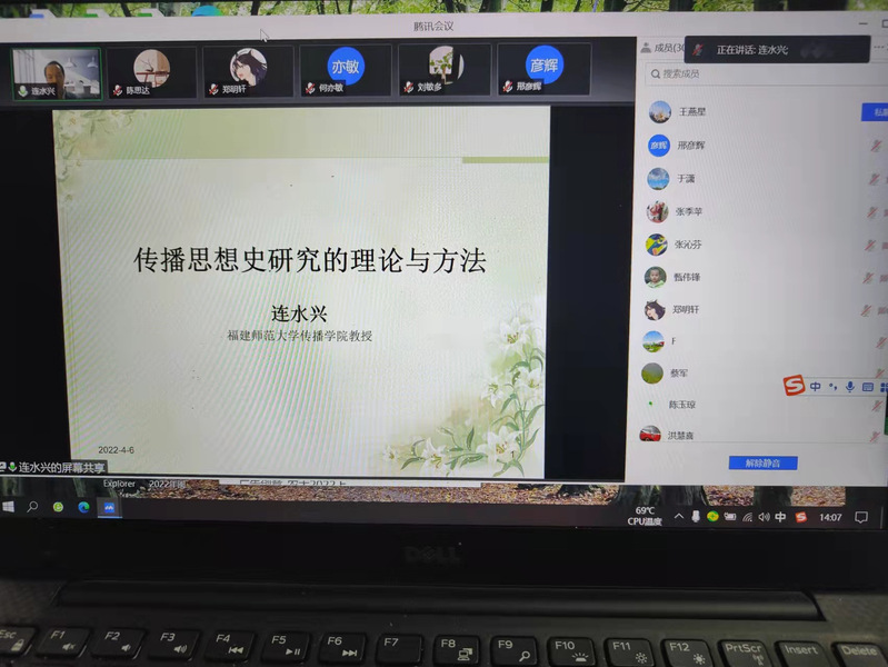 2022年4月6日下午,福建师范大学传播学院连水兴教授应学院邀请,通过腾讯会议,为同人小说 教师带来一场题为《传播思想史研究的理论与方法》的精彩学术讲座,院长助理陈思达副教授主持讲座,全院20余名教师线上共同聆听了讲座。