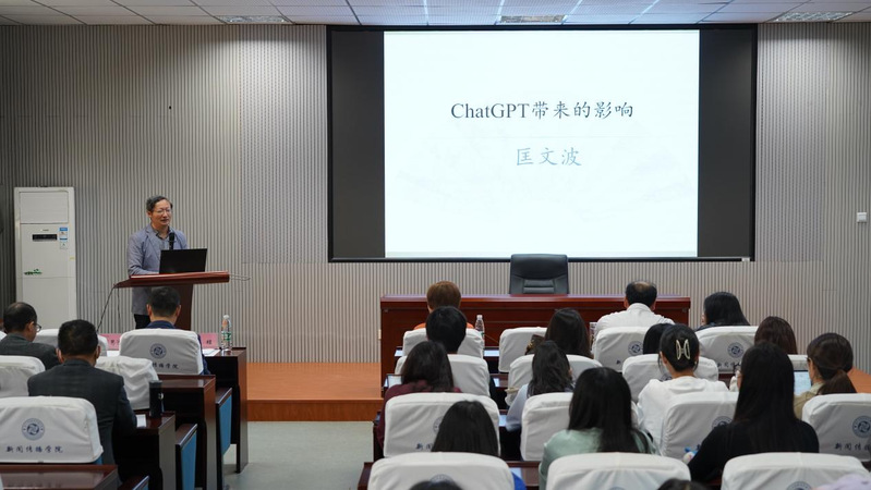 主题发言环节,中国人民大学新闻学院匡文波教授以“ChatGPT带来的机遇和挑战”为题,分享他对新技术出现的思考。他首先指出ChatGPT使人类信息传播开始面临数据和算法驱动的智能媒体的全面侵蚀和冲击,并通过ChatGPT热的冷思考阐述其内容生成存在的不确定性,强调新技术的双刃性与低成功率。随后他从ChatGPT带来众多模仿者的角度出发,就模仿的后发优势所带来的机遇及后发劣势所带来的挑战展开详细论述。