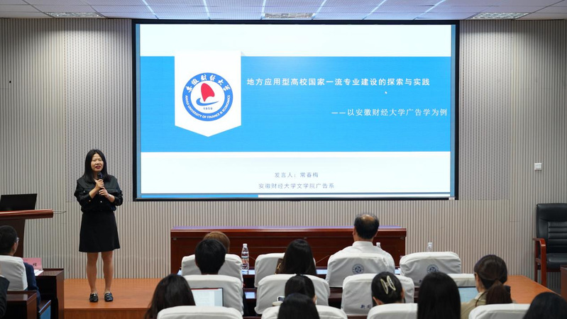 安徽财经大学文学院广告系主任常春梅副教授以“地方应用型高校国家一流专业建设的探索与实践”作主题发言。她以安徽财经大学广告学为例,将“双万计划”为地方高校本科专业带来的新机遇作为出发点,结合地方应用型高校专业建设面临的区域间、校发展不平衡不充分矛盾的挑战展开论述,随后以安徽财经大学办学特色、广告学专业现状、师资力量、毕业生就业及硕士研究生推免情况角度分析,指出要立足“新经管”发展战略,培养具有全媒体传播知识和能力的应用型、复合型、创新型人才,打造产教学研一体化教学。最后她提出要建设一流课程和一流教材,继续提升产教研用教学一体化建设,建成具有新经管特色的广告学国一流专业的未来目标愿景。