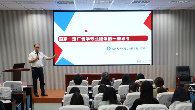 武汉大学新闻与传播学院程明教授就“关于国家一流广告学专业建设思考”作主题发言。他提出学科的建设应结合顶层设计的思维,专业建设的思路应脚踏实地,并针对广告学一流专业建设的五点因素和“培养方案与课程体系”进行分析,指出专业建设的落脚点是培养出一流的学生,未来应以交叉融合的新文科思路来发展广告学。最后他以“平台为基础,人才德课特”的思路阐述广告教育的未来,用“正是因为未来充满不确定性,才充满无限可能”鼓励在场师生。