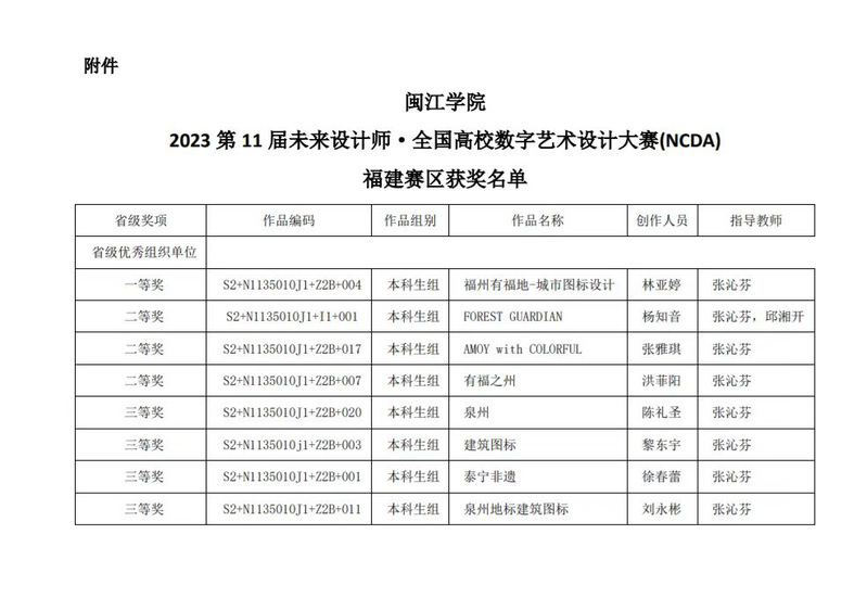 在2023年第11届未来设计师•全国高校数字艺术设计大赛(NCDA)中,同人小说 学子斩获福建赛区一等奖1项、二等奖3项、三等奖4项,如此优秀战绩体现了同人小说 学生良好的艺术与人文素养,一展新传风采。