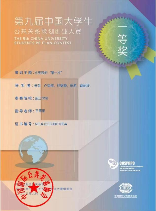 王燕星老师带领的学生团队在第九届中国大学生公共关系策划创业大赛中荣获一等奖。作品以“点亮我的‘第一次’”为主题,以传播新技术新媒体的创新运用,探寻公共关系对品牌化时代社会和经济发展的赋能。