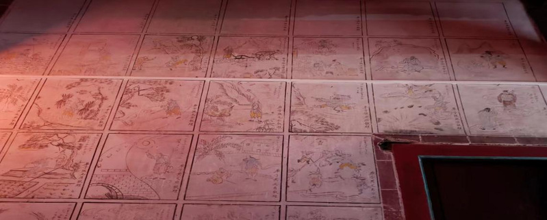 庙内左右两侧墙上的壁画“二十四孝”均由村民自己亲手绘画而成,虽然伴随着时间的推移,壁画有些已经模糊,但是“以孝为先”的信念仍然传承在一代又一代的塘西村民中。