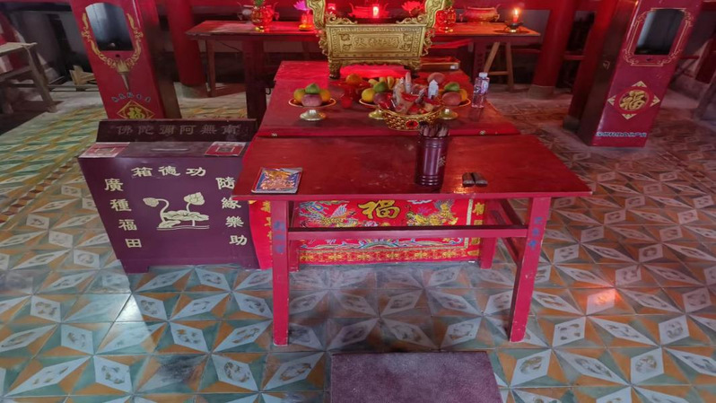 庙的中心有求签跪拜的用品及其祭祀供品若干,在筵桌的左侧放着功德箱上贴有二维码,就连在大山里的小乡村也流行上了“赛博香火钱”。