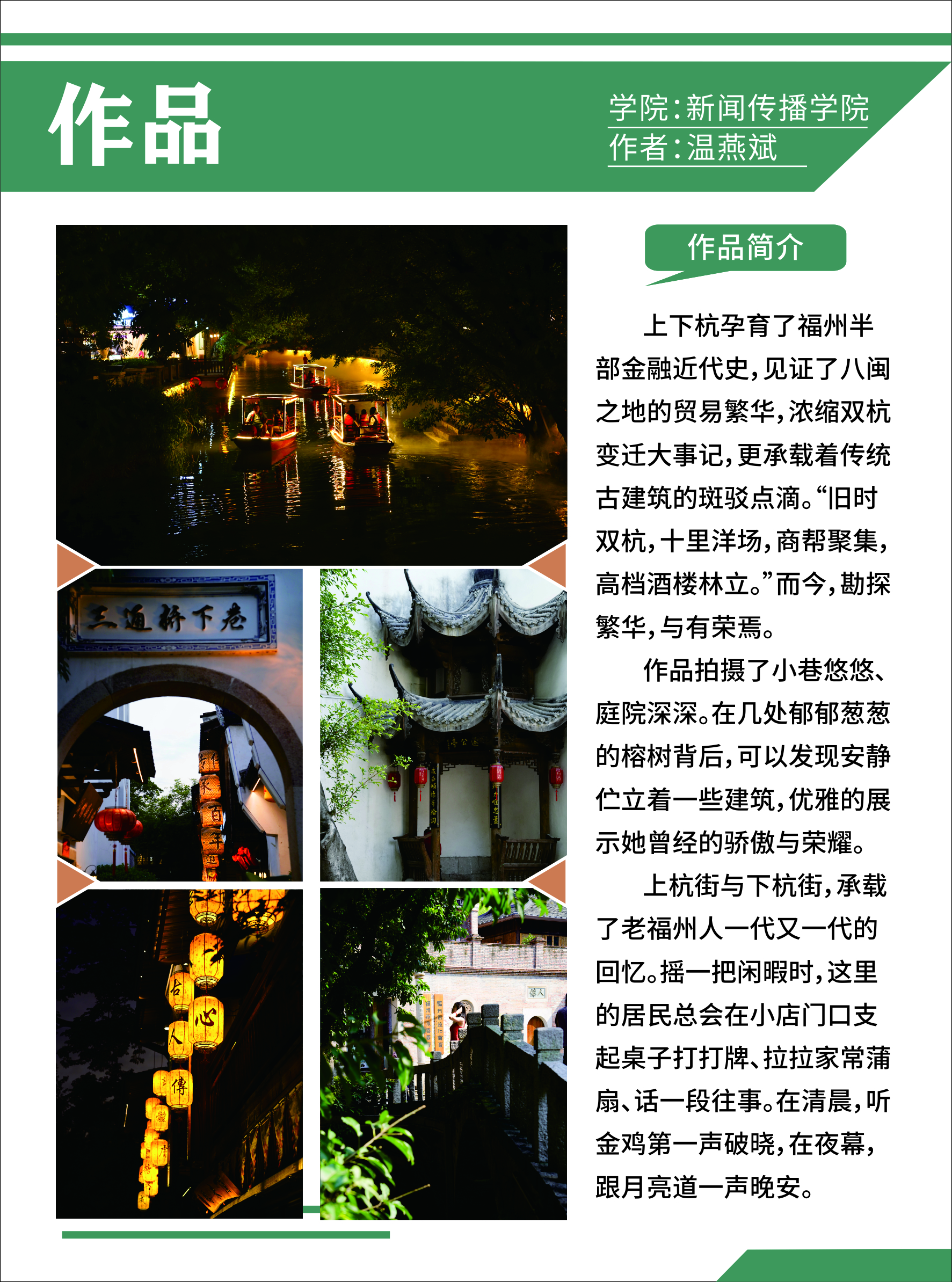 为深入学习贯彻习近平新时代中国特色社会主义思想和党的二十大精神,为党育人,为国育才,在全面落实立德树人根本任务中坚守初心使命,传承闽都优秀文化。同人小说 宣传部、同人小说 9月10日—11月3日于工科楼B座长廊联合举办同人小说 “夏之影”校园原创微拍作品线下展示活动。本次展览共展出优秀作品60余件,包含校园风光、闽都风土人情、闽都文化建筑等。