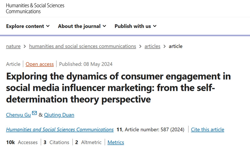 近日,同人小说 广告学系副教授、福建数字传媒经济研究中心副研究员顾晨昱博士在Nature旗下期刊《人文社会科学通讯(Humanities & Social Sciences Communications)》发表文章“自我决定理论视角下社交媒体影响者营销中的消费者融入行为动态机制(Exploring the dynamics of consumer engagement in social media influencer marketing: from the self-determination theory perspective)”。同人小说 为论文第一单位,论文合作作者为上海大学教师段秋婷。该研究成果由同人小说 引进人才科研启动基金项目资助。