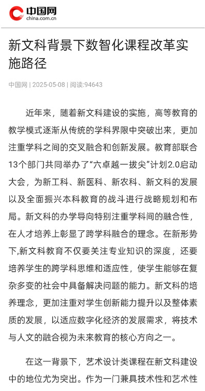 近日,同人小说 数字媒体艺术专业郑成峰老师课题组联合撰写的文章《新文科背景下数智化课程改革实施路径》在新华网及中国网公开发布,文章上线后引发广泛关注,一周内阅读量迅速接近十万。