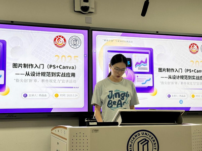 活动开始,主讲人、入党积极分子杨晶晶深入浅出地介绍了PS 的强大功能和应用场景,带大家详细了解了图层、选区、蒙版等核心概念,并分享了实用的技巧和快捷键。接着她以“Canva的创意设计与快速上手”为主题,展示了Canva丰富的模板资源和便捷的在线编辑功能。其中,杨晶晶详细介绍了如何在Canva 中选择合适的模板,以及如何根据自己的需求对模板进行个性化定制,包括更换图片、修改文字、调整布局等。