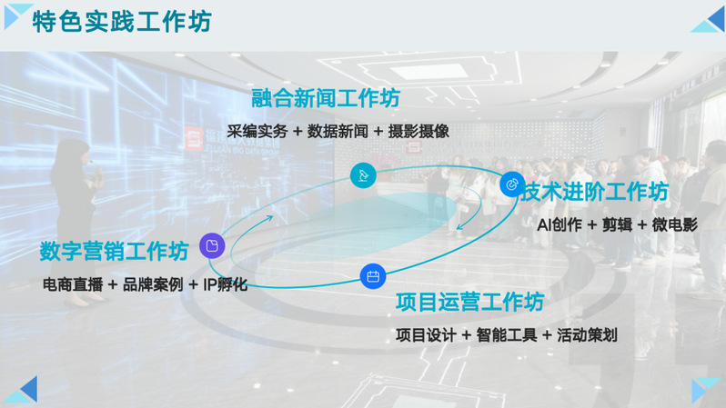 在具体办学特色及优势方面,定制班与福建省广播影视集团、福州日报社等主流媒体,植护、掌中云、多米互娱等多家网络科技公司建立了深度合作机制,依托融合新闻、技术进阶、项目运营、数字营销四大实践教学工作坊,为学生开设涵盖理论与行业认知、内容创作与生产、平台运营与管理、数字营销全流程的校企共建课程体系。