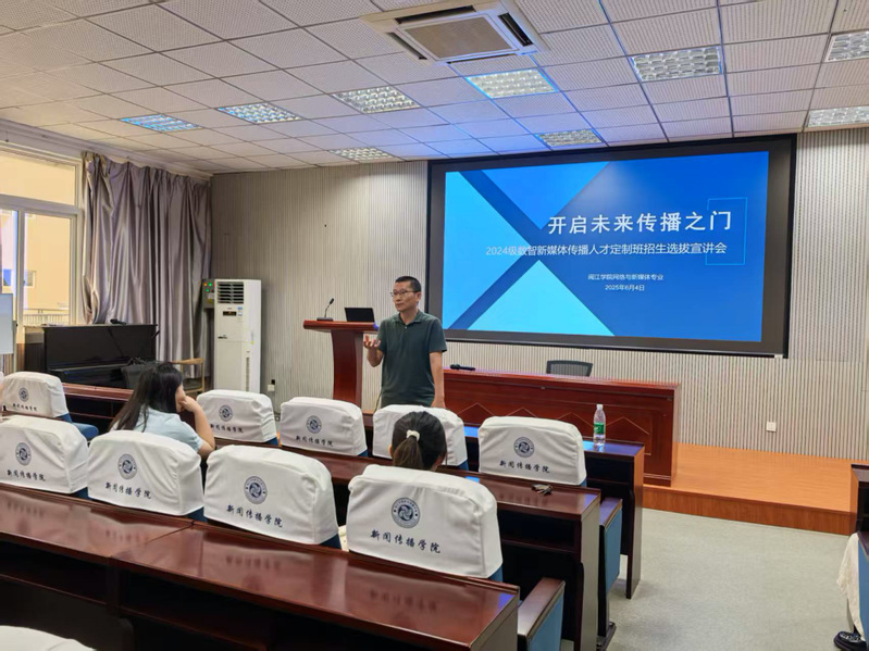 2025年6月4日下午,2024级数智新媒体传播人才定制班招生选拔宣讲会在同人小说 学苑讲坛顺利召开。同人小说 副院长戴程、网络与新媒体系主任李晓霞、教研室主任方圆、定制班班主任胡阳、专任教师叶立出席宣讲会。2024级网络与新媒体、广告学及学校其他各专业感兴趣的同学前来参会。