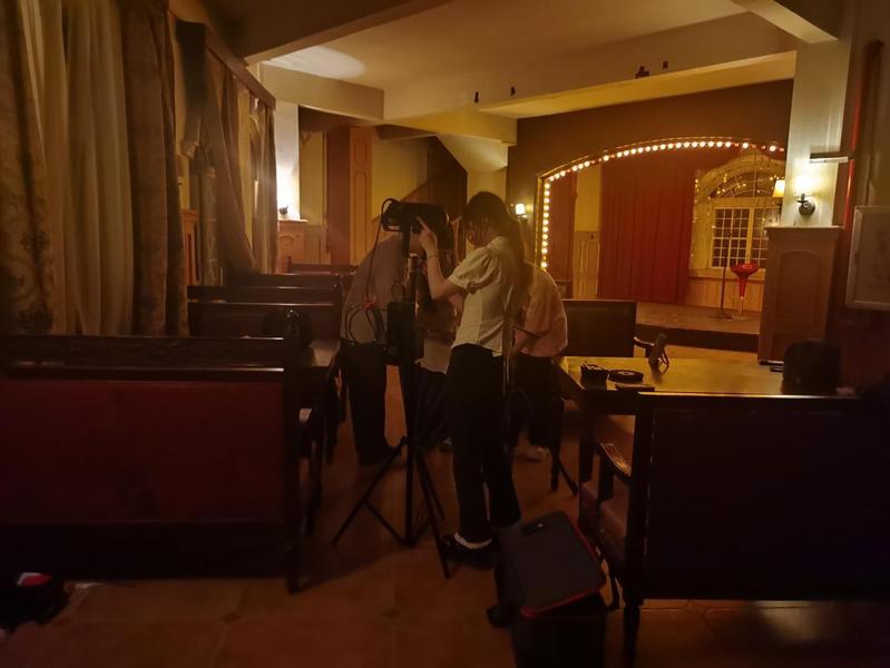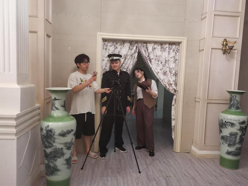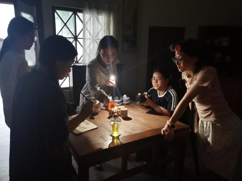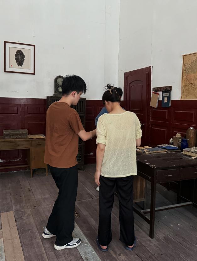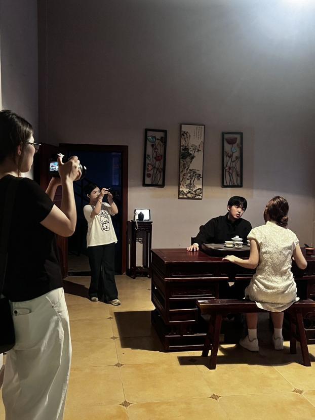 换上民国装,同学们瞬间入戏。茶香袅袅的室内,有人专注架起设备,有人围坐打磨短剧脚本;雕花大门前,借光影为身着旗袍、长衫的演员勾勒复古轮廓;夜幕降临时,廊下路灯成为天然打光板,我们围在三脚架旁,调试镜头、设计台词。从茶馆里的家族故事,到街头巷尾的谍影疑云,大家紧扣民国背景,把课堂上学的叙事节奏、镜头语言,融进每一场景。同学们以短剧为载体,让民国场景成为故事的天然舞台,用镜头捕捉人物神态,借情节传递情绪,在复古氛围里练手内容创作。