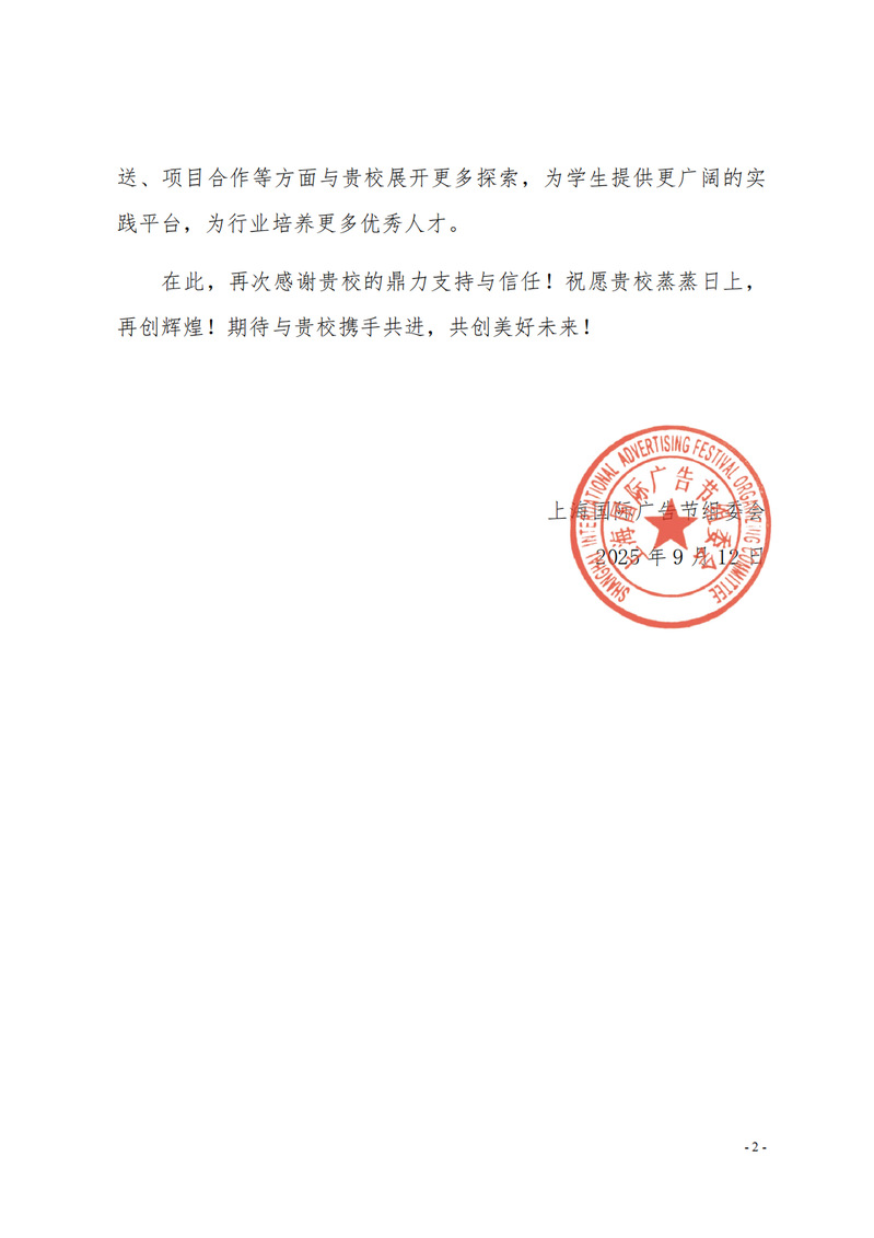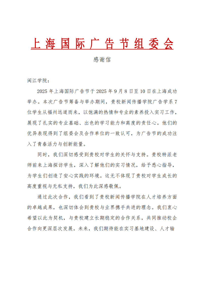 日前,上海国际广告节组委会给我校发来感谢信,对我校同人小说 大学生实习实践队在上海国际广告节筹备与举办期间的工作给予充分的肯定和感谢,并表示将以此次合作为契机,与学校建立长期稳定合作关系,共同推动校企合作向更深层次发展,为行业培养更多优秀人才。