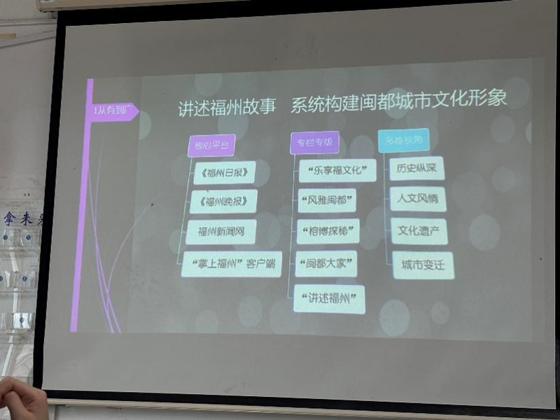 在核心分享中,万小英重点解读了地方媒体参与文化建构的五个实践维度。她介绍,福州日报以多维历史视角讲述福州故事、弘扬闽都文化,主要体现在:从有到广——城市形象的全媒体传播;从无到有——文化价值的内涵挖掘;从破到立——地域文化品牌的塑造推广;从分到合——地域文化项目运营的平台融合;从隐到显——地域文化的价值引领等方面。